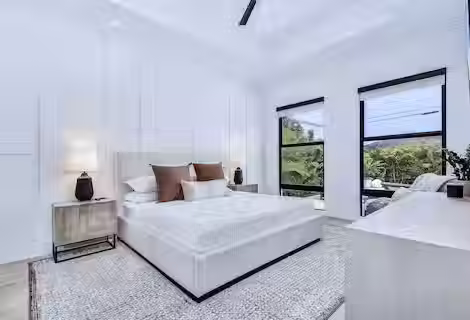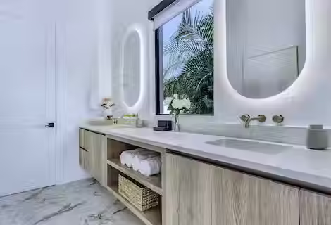 Modern Oasis Naples Park is an open concept dream home with the perfect layout for private sleeping quarters. Each of the 4 bedroom suites has a king sized bed, a high-end Sony Smart TV ranging from 55-75 inches, and private ensuite bathroom. The main living area boasts a custom sectional sofa, 85 inch Sony X90L Smart TV under soaring 18 foot ceilings, a stunning chef's kitchen with Jenn-Air appliances fully equipped for meal preparation, and ample island and table seating. The backyard has more dining seating next to the covered propane grill, heated salt water pool and hot tub, sun tanning lounge chairs as well as a shaded lounge area, pool toys, outdoor games and more.
